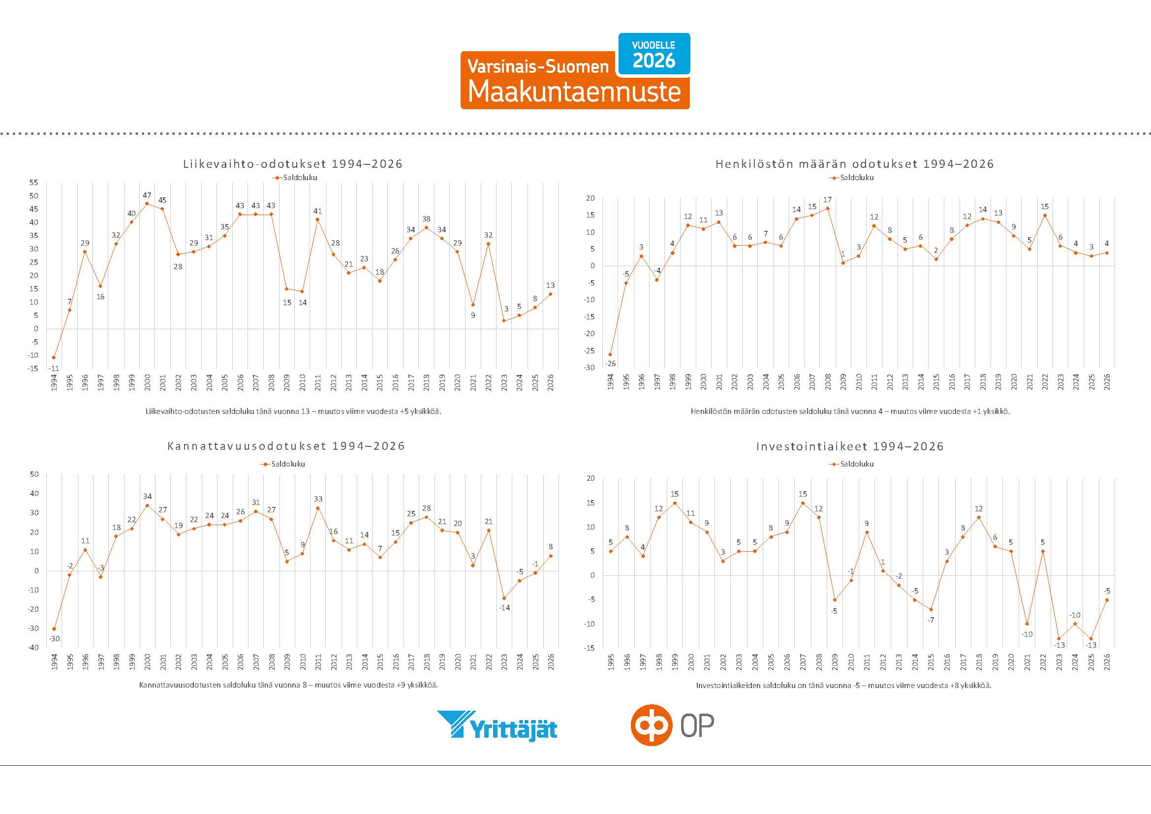 Varsinais-Suomen Maakuntaennusteen toteuttaminen yhteistyössä Varsinais-Suomen Yrittäjien kanssa on tärkeää varsinaissuomalaisille Osuuspankeille. Meille on tärkeää kuunnella yrittäjien näkemyksiä talouden kehityksestä ja heidän odotuksistaan alkavan vuoden näkymistä.